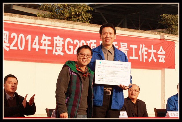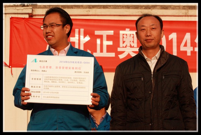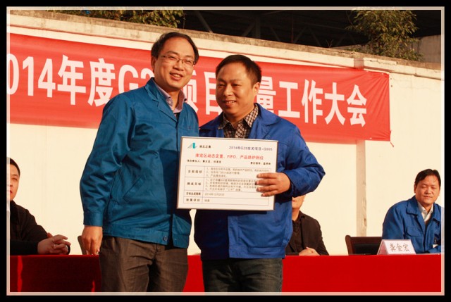 到會領(lǐng)導(dǎo)為G29項目組成員頒發(fā)了戰(zhàn)表,為下一階段的改善制定新的挑戰(zhàn)目標(biāo),全體員工見證了這一重要時刻,并在會議現(xiàn)場用熱烈的掌聲表達(dá)了完成任務(wù)的信心和決心。